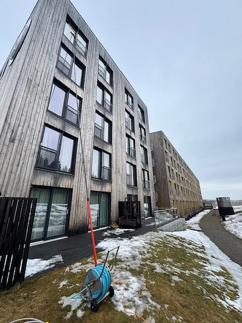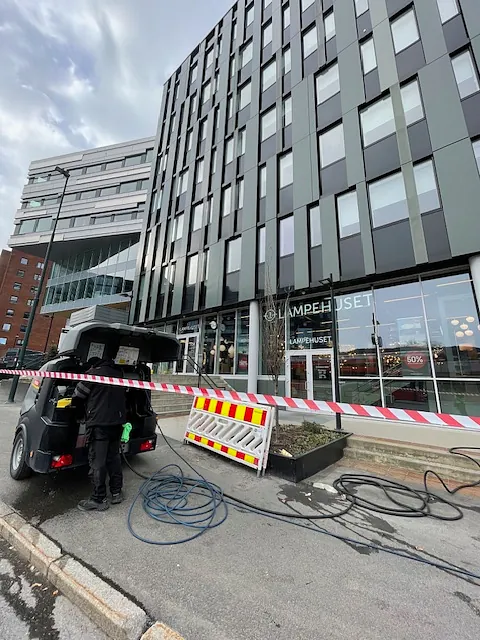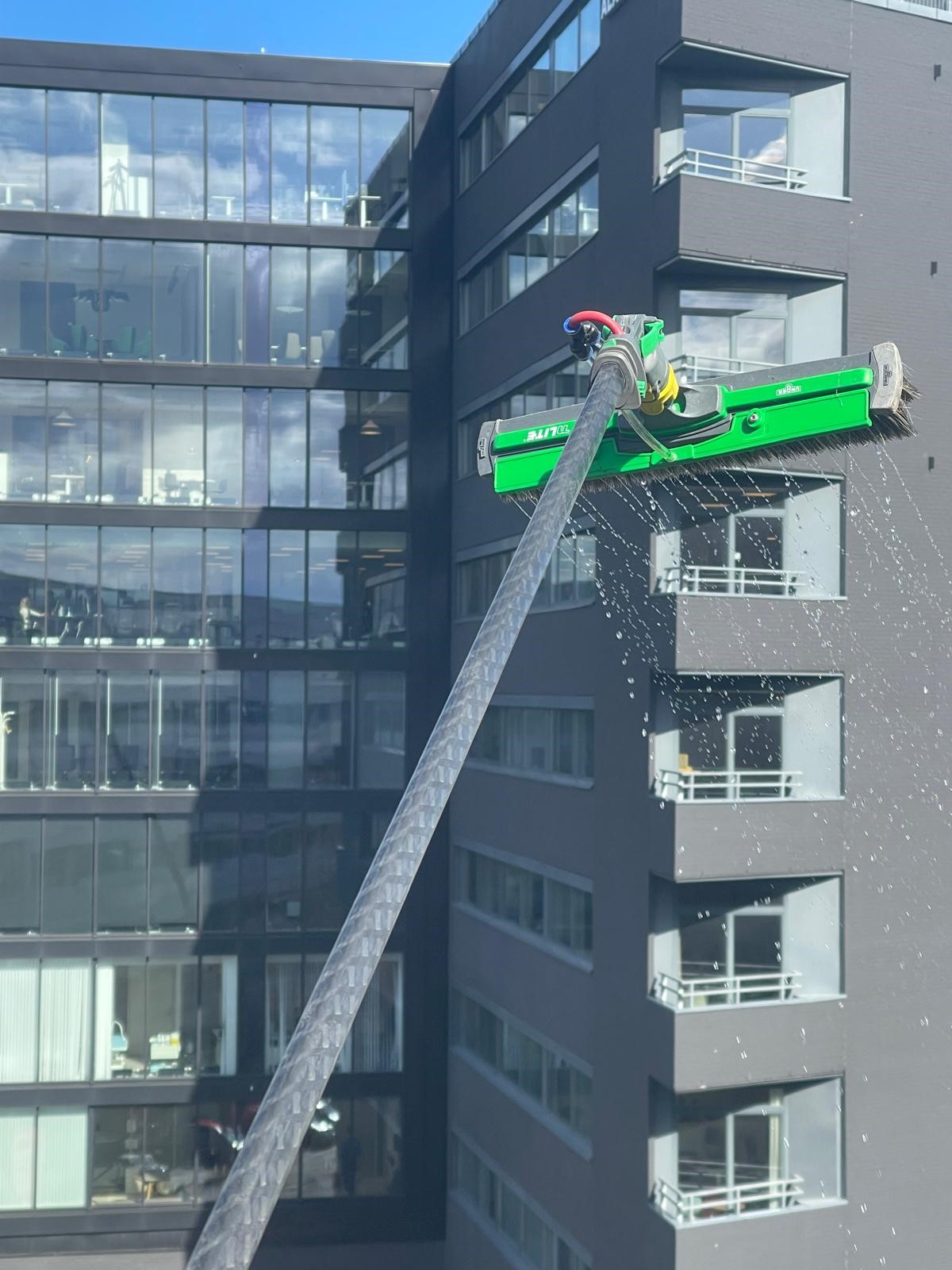 Når det gjelder fasade- og vindusvask bruker vi, blant annet, høytrykksspyler med varmtvann opptil 60 varmegrader med fasadevaskemidler som egner seg til alle typer fasader, fjerner smuss, trafikkfilm, belegg og vekst, mm.